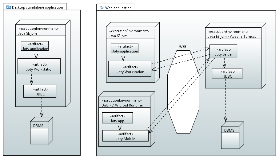 Joty is a purely Java based framework that for the Workstation part is largely based on the javax.swing package of Java SE, Joty Server, in the Core part, is a subclass of the javax.servlet.http.HttpServlet class of Java EE, and the Mobile part is based on the Android Sdk and Java SE