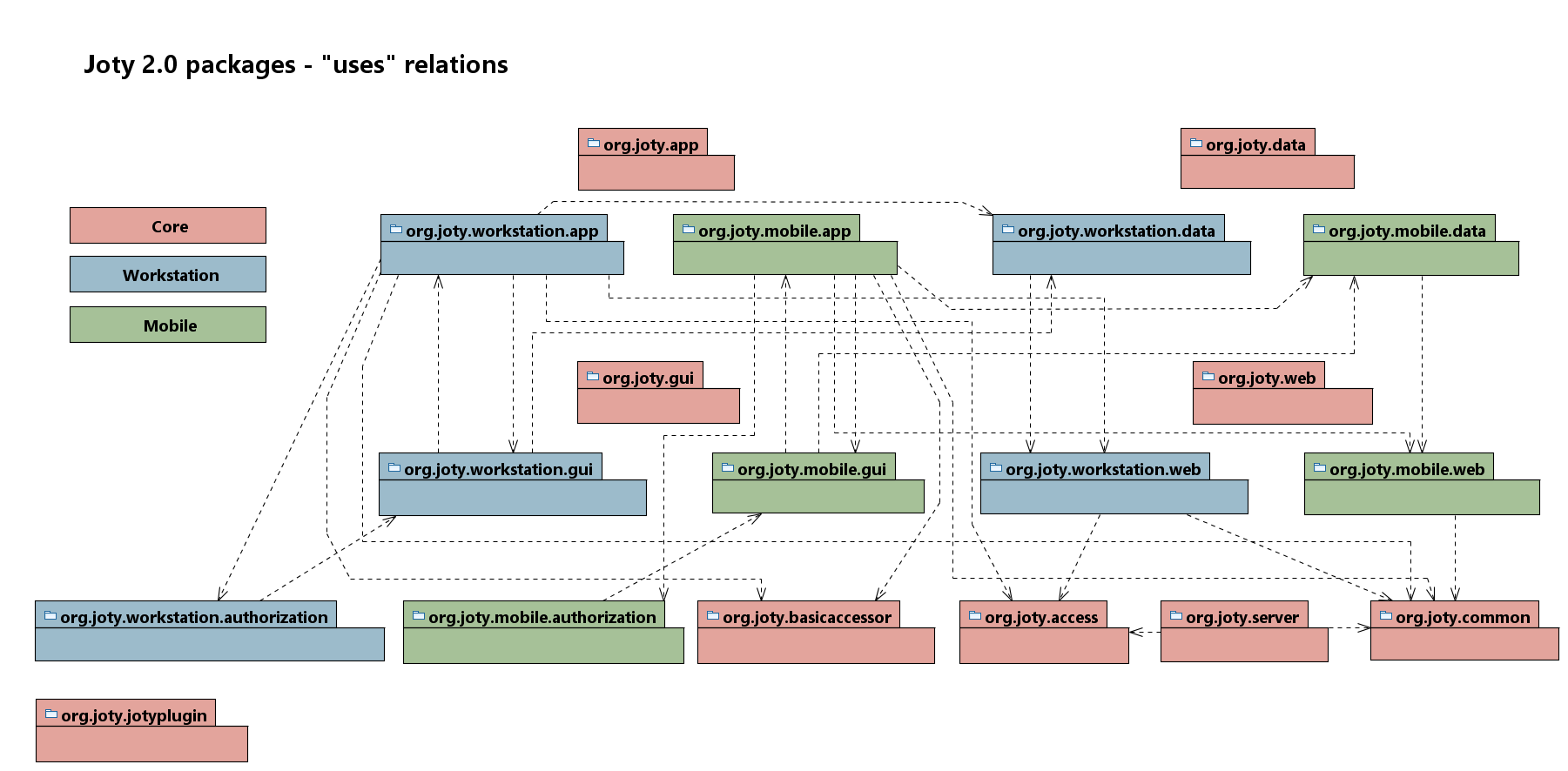 Then those classes invokes the services of the org.joty.workstation.data and org.joty.mobile.data packages respectively and/or the ones of the org.joty.workstation.web package in a web scenario for Joty Workstation and of the org.joty.mobile.web package always for Joty Mobile.