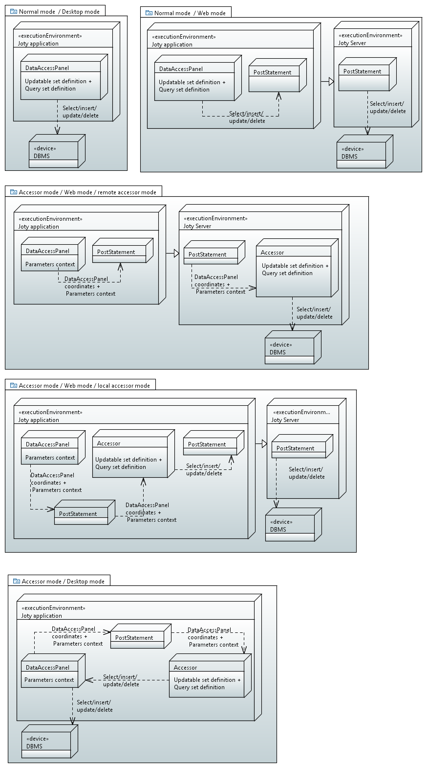 The org.joty.access package, beyond supporting many tasks like the reporting management, giving integration with the BIRT (Business Intelligence and Reporting Tools) technology, it takes great importance since it hosts the Accessor class and, as such, it is deployed either to the server side or into the Workstation application when it runs in local accessor mode (see the definitions given just below in the dedicated paragraph).