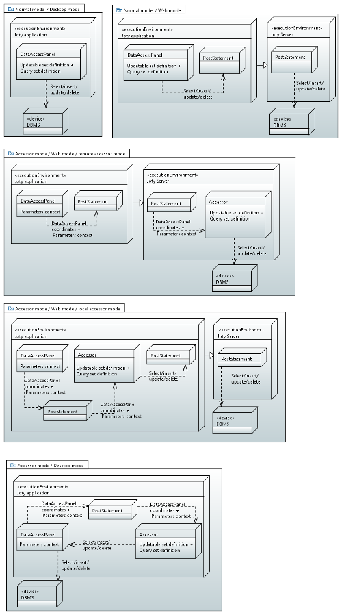 It can also be seen that (as illustrated in the fifth block) the Accessor can be prepared and kept local during the life of the workstation application in the desktop standalone mode. This is perfectly in harmony with the original mission of the Joty framework: allowing a simple switch for passing from the testing in desktop mode to the testing in web mode.