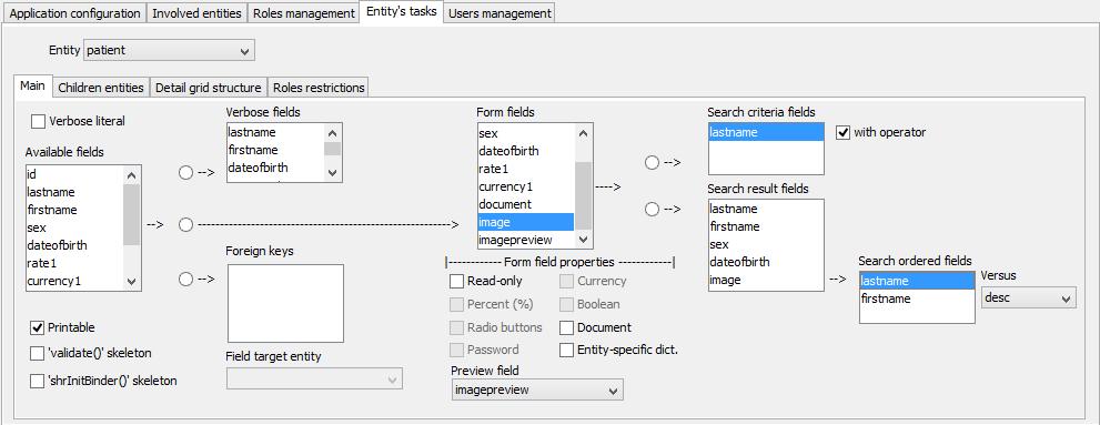 - Printable if checked the generator will add a print button in the buttons at the bottom of the page when the entity is recalled by the user through the search/list page. The button is then bound to the launch of the Birt report define by the file named "[entity-name]List.rptdesign".