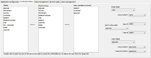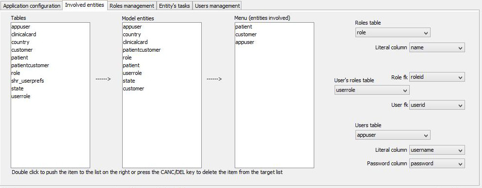 The 'tables' list-box is filled during the loading of the meta-data and is the source of entities that need to be represented in the final application: the adjacent 'Model entities' list-box is the collector of the choices made by a 'pushing' double-click on the rows of the first listbox.