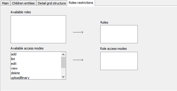 For each role pumped in the upper list-box, by selecting the value, it is possible to specify one or more access mode that will enable that role to access the above selected entity.
