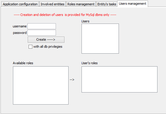 It is an helper feature since a connection to the target database is available and, even, the dedicated tables to users and roles representation are mapped by the generator tool. As clearly highlighted, however the underlying ddl for the dbms level definition of user is provided only for MySql.